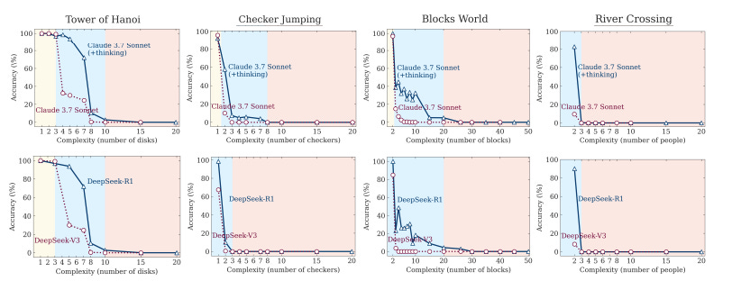 You can see the ‘collapse’ Apple mentioned in the following set of charts, which show the ability — or lack thereof — of AI models from Anthropic and DeepSeek to solve increasingly complicated puzzles: