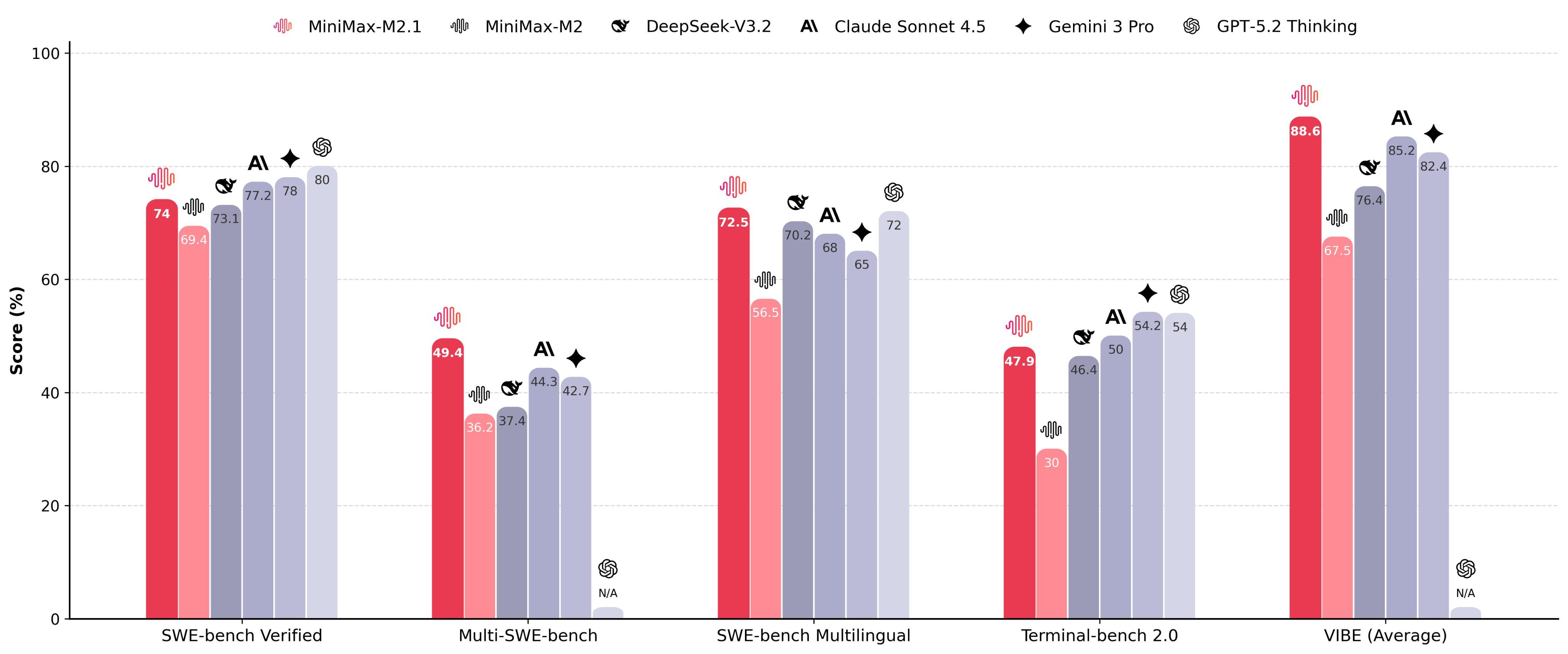 MiniMax’s AI models are good. The company’s current leading model, MiniMax M2.1, compares well with models from both China (~open) and the United States (closed):