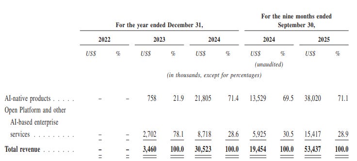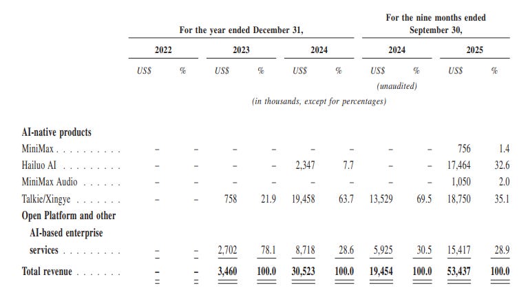 You can think of AI-native products as the things MiniMax has built that consumers can buy (access to the MiniMax app, its Hailuo AI video-generating app, and its AI chat service Talkie), while the latter category represents enterprise incomes.