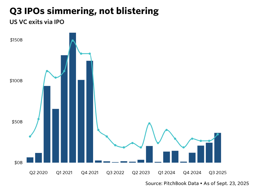 PitchBook data indicates that we’re near the tail end of the best quarter for IPOs since 2021. But it doesn’t feel like that because Q3’s results aren’t really that much better than what we saw earlier this year and for brief periods in 2023 and 2024: