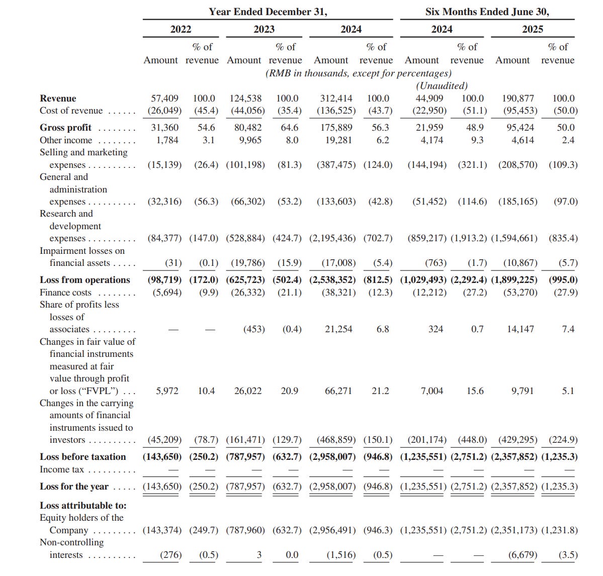 R&D expenses increased from RMB84.4 million in 2022 to RMB528.9 million in 2023 and further to RMB2,195.4 million in 2024. [And its] R&D expenses increased by 85.6% from RMB859.2 million in the six months ended June 30, 2024 to RMB1,594.7 million in June 30, 2025.