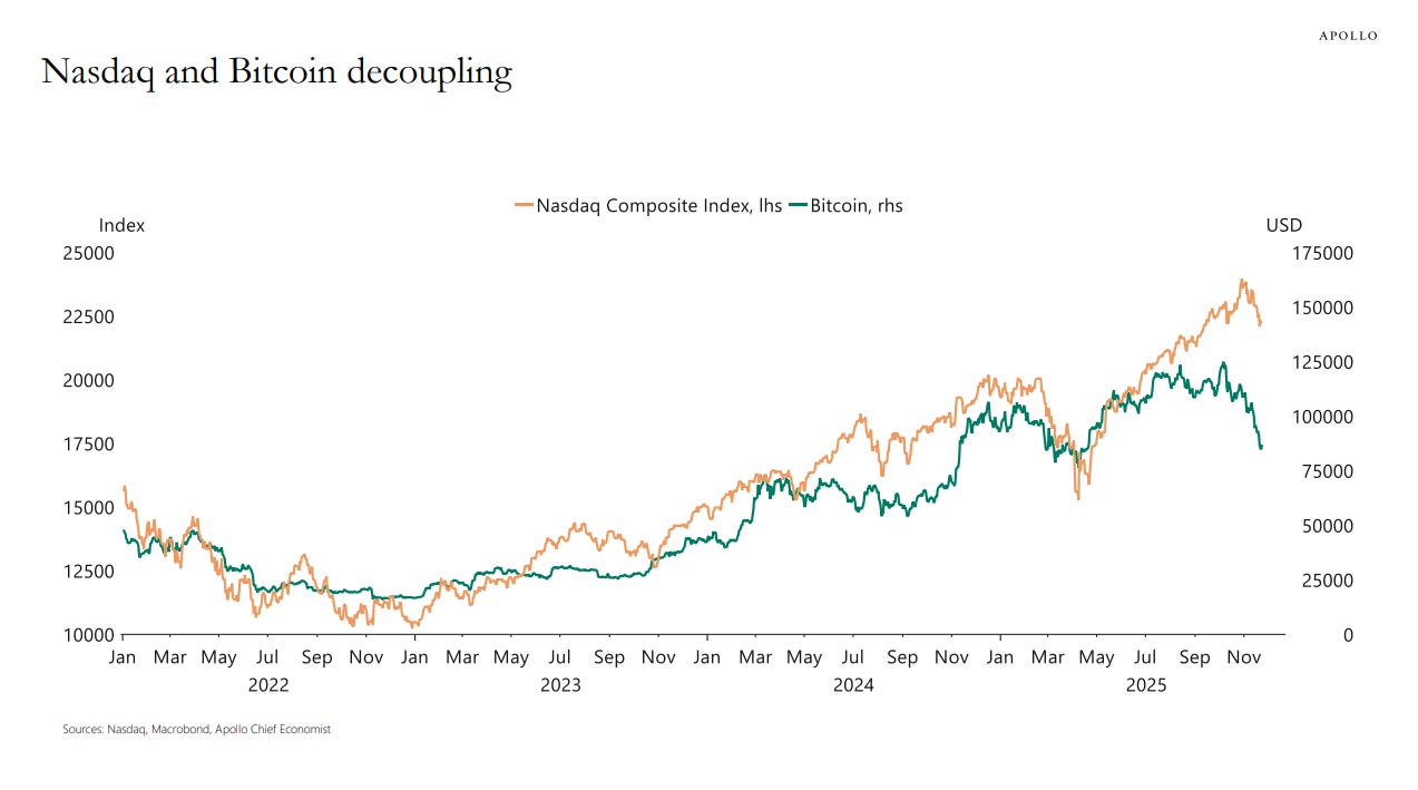 Chart of the Day, via my former employer Apollo: The crypto selloff did more than take the wind out of the sails of crypto-treasury companies. It also decoupled the value of bitcoin and the Nasdaq Composite: