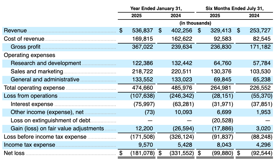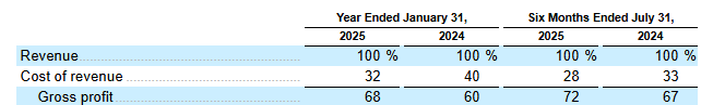 An increasing amount of our support services are becoming automated through our AI-powered virtual agent chatbot, Ava, handled approximately 50% of user interactions without live agent intervention during the six months ended July 31, 2025. Our ability to control customer support costs over time, even as customer support volume has increased significantly, has contributed to an increase in gross margin from 60% in fiscal 2024 to 68% in fiscal 2025, and non-GAAP gross margin increased from 62% in fiscal 2024 to 69% in fiscal 2025.