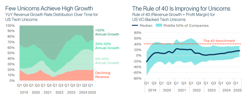 Perhaps worse, an even larger percentage of unicorns are growing so slowly as to be worth just a few times their top line, and more than 50% of unicorns currently fail the Rule of 40: