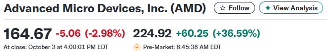Why bring all that up? The number of companies currently eating well off the AI table is pretty damn huge. So if the AI bandwagon hits a pothole, it won’t harm just the companies investing in data centers; the firms the hyperscalers are buying would also eat their own shoes. That means the stock market is currently incredibly responsive to AI demand (as exemplified by AMD’s stock today — see below).